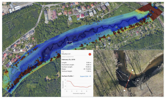 The determination of hydromorphological features and the assessment were based on the standard methodology of a hydromorphological survey, using, as the basis, the high-resolution, seamless orthophoto map from the UAV monitoring instead of a field survey for the visual assessment. The conjoint availability of the 3D model, along with the high-resolution orthophoto map resulting from the photogrammetric assessment, allows for a detailed exploration of the morphometric features of the stream (Figure 3). The determination of some parameters, such as the water quality or the coherence of riparian vegetation, can be supported by the calculation of spectral indices or by classifications derived from UAV orthoimagery, even in the case of RGB imagery [8]. In addition to the scoring of the indicators in segments, UAV orthoimagery and 3D models provide information for the further interpretation of the critical aspects of the restorations and for their detailed analysis.