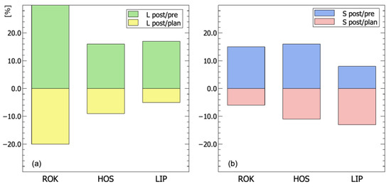 In all cases, stream restorations resulted in meandering channels that basically aligned with the plans and fit to the natural stream patterns corresponding to the given environment. However, all realized restorations are significantly less complex than planned. In the oldest restoration project (ROK), there is the highest deficit in length between the planned restoration and the realized restoration (−19.5%); in the most recent project, the new stream is shorter by just 9.5%. The deficit in stream sinuosity and the number of meanders are, to the contrary, the worst in the newest project, the LIP brook. The deficit in stream sinuosity reaches 12.8%, and the number of constructed meanders is lower by 58.2% (Table 2). In all projects, the deficiency of the stream length and sinuosity reaches almost half of the gain reached by the restoration (Figure 4). Such reduced complexity significantly limits the expected hydroecological effects of the restorations.