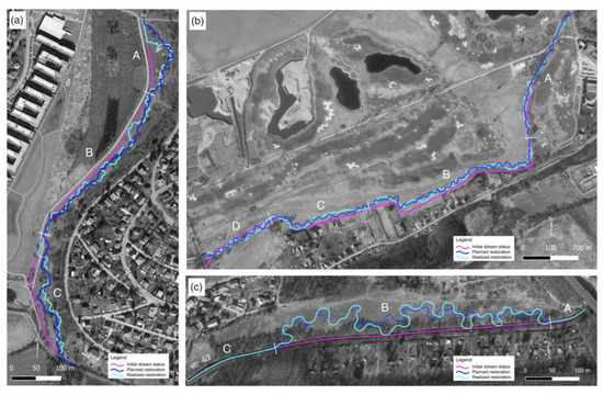 The three key stages for assessing the restoration effect by determining the geometric changes are the initial status, the restoration plan, and the realized restoration (Table 3). The fit of the restored channel to the approved plan serves as a fundamental indicator, reflecting the general meeting of the restoration goals. Restoration plans are typically designed using hydraulic models and undergo a complex hydroecological evaluation [60,61]. Hence, the substantial deviations of the restored stream from the approved plans should be regarded as a warning sign indicating that the functions of the restored stream in terms of hydraulics, sediment balance, water quality, or hydrobiology may be different than expected.