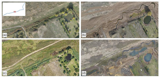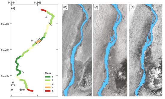 The qualitative assessment is focused on the principal aspects of changes affecting the hydromorphological and ecological quality of streams, such as the channel morphology, hydrological processes, and riparian vegetation (Table 3). The restoration quality and evolution of the stream after the project completion were assessed on the basis of UAV monitoring data in stream reaches delineated on the planform of the resulting restoration according to the principles of hydromorphological monitoring [60,61].