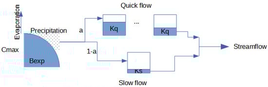 HYMOD employs 5 parameters (Figure 1): the maximum storage capacity in the catchment Cmax, the ratio of the diversion to quick- and slow-release reservoirs, the factor Bex,p which defines the variability in space of the surface soil moisture capacity, the outflow coefficient Kq of the quick water storage tank, and the outflow coefficient Ks of the slow tank. HYMOD simulations were performed with a model version implemented in R programming language. The parameters were optimized with the DEoptim R package, which implements the differential evolution algorithm for global optimization of a real-valued function of a real-valued parameter vector [].