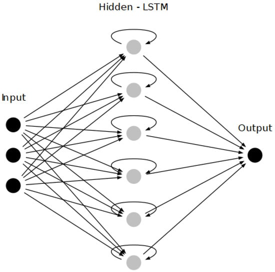 The network topology is displayed in Figure 4. It is a recurrent neural network (RNN) employing long short-term memory (LSTM) []. The three input nodes correspond to the time series of rainfall, evaporation and simulated values from the hydrological model. The network has 6 nodes in the hidden layer (twice the number of inputs). A single node was used as the output, which is the approximation of the best model achievable with the available data (see Equations (1) and (2)). It is noted that the topology of Figure 4 is slightly different from that used in [], for which an equal number of nodes in the input and hidden layers was used. This modification was made due to slightly better performance observed with the setup of 6 nodes. The activation function between input and hidden layers is LReLU, and between hidden and output layers ReLU [].