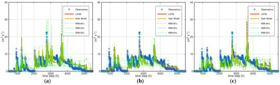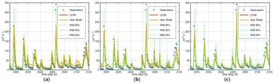Simulation of Arno River, for time steps 1990–2120 of the test period: (a) HYMOD (note how LSTM avoids the overestimation of the low flows); (b) LRHM; and (c) GR4J.