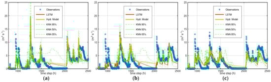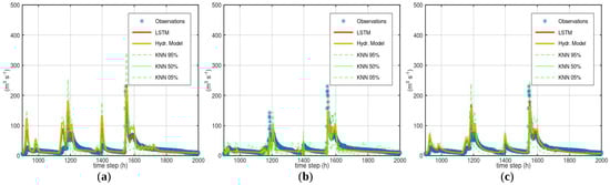 To cope with the previous issues, we examined what benefits could be obtained by combining two or more hydrological models. The idea behind this concept was that by combining two or more hydrological models, the conditional errors (errors that happen under certain conditions, and hence, may not be present in the training period) may be reduced, which would give a chance to LSTM and KNN-Bluecat to capture them. The model simulations were combined by taking the mean values (more sophisticated methods, such as using both models as the inputs of the ML network were not proved advantageous). It is noted that approaches based on multiple models (model ensembles) combined with Bayesian averaging have been successfully applied by other researchers [].