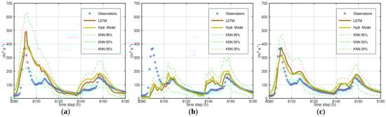 Simulation of Sieve River, for time steps 8080–8180 of the test period: (a) HYMOD; (b) LRHM (note the confidence interval between time steps 8080 and 8100); and (c) GR4H.