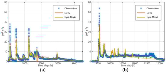 LRHM failed to reproduce some events in the case study of the Sieve River (see Figure 7b and Figure 8b), for which LSTM did not indicate that the LRHM value was erroneous. It is not clear why this occurred. It may have been because there was no sufficient signal strength from similar incidences during the training period to allow LSTM to learn from it. That is, during the training period, there were only three events with a flow greater than 100 m3/s that LRHM fails to simulate. These three events corresponded to around 60 observations of the training data out of a total of 27,415 observations. However, the sparsity of high flows in the data is typical in hydrological applications. Therefore, the value of LSTM in detecting the errors of a single hydrological model in high flows is disputable.