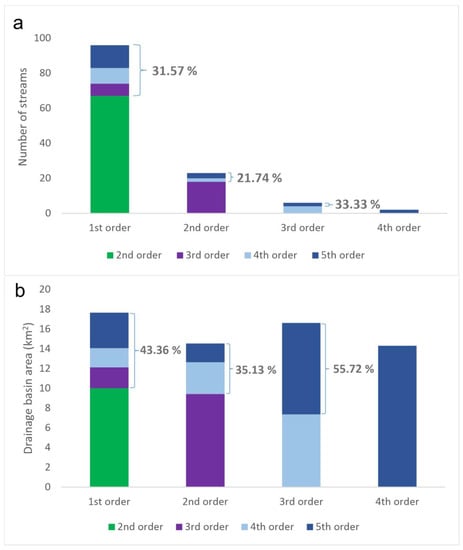 Hierarchical drainage by stream order for Kladeos River drainage network (a. Number of streams and b. Drainage basin area).