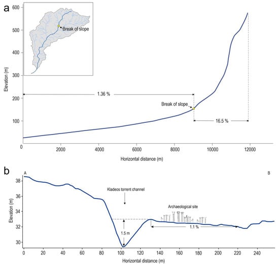(a) Longitudinal profile along the main channel of the Kladeos River. (b) Cross section at the lower reaches of the main channel. The location of the cross section is depicted in Figure 1.