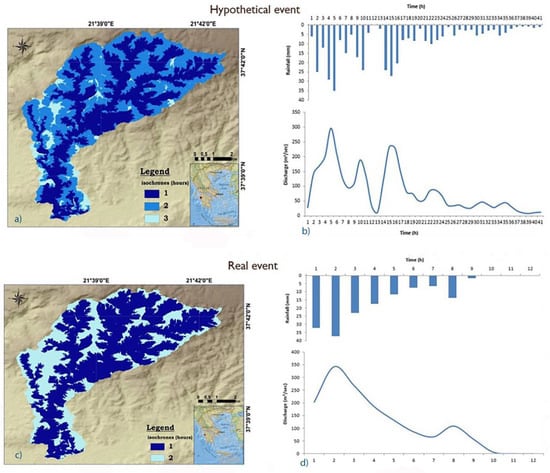 The hypothetical event and its results: ((a) isochrones map, (b) rainfall-discharge chart) and the real event hydrological results ((c) isochrones map, (d) rainfall-discharge chart).