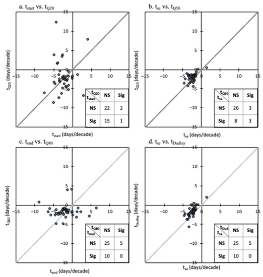 Comparison of the timing metric trends for the (a) start, (b) half-flow, and (c) end of the snowmelt contribution to the streamflow, and (d) Dudley. The tables in the bottom right corner indicate the number of stations at which the trends were not significant (NS) and significant (Sig).