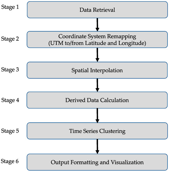 Stage 5 utilizes the K-Means data clustering algorithm [40] to group grid points into groups of points that have similar time-based profiles, thus reducing the number of time series profiles that need to be fed into models. The algorithm starts by grouping adjacent grid cells into a specific number of clusters N selected by the user. Higher N values will give more accurate results, but will produce a larger amount of data. Then, the average daily data value (e.g., daily LAI) is calculated for each cluster, generating a daily time-series profile for each cluster. The statistical distance di,k for each cell i to cluster k is then calculated as: