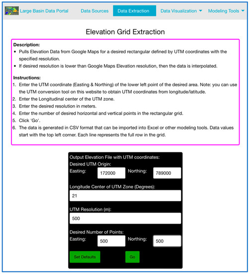 Elevation/Topology grids are the most critical input to any hydrological model. The topology of the modeled area governs how and where overland and underground water flows, creating streams and rivers and lakes. Within the Large Basin Data Portal, a user can easily obtain the required elevation grid for the area of interest by simply specifying the model’s rectangular area and the resolution of the grid. The elevation data are then extracted from Google Maps [42] using an API in the background. The tool (Figure 2) then utilizes the Coordinate System remapping and Spatial interpolation stages to produce the final grid in the desired resolution. Finally, the grid is written to a CSV (Comma Separated Values) text file which can be used in or imported into various modeling programs. A simple demonstration of the use of the Elevation Grid Extraction tool and other data extraction tools is available in Video S1.