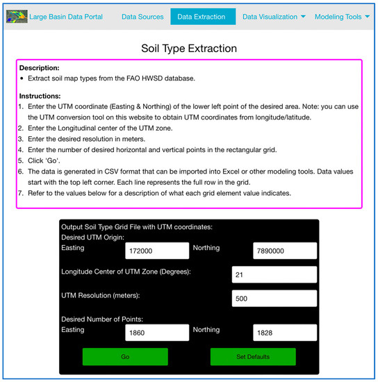 Screenshot of the Large Basin Data Portal soil type extraction tool with description, usage instructions, and input parameters.