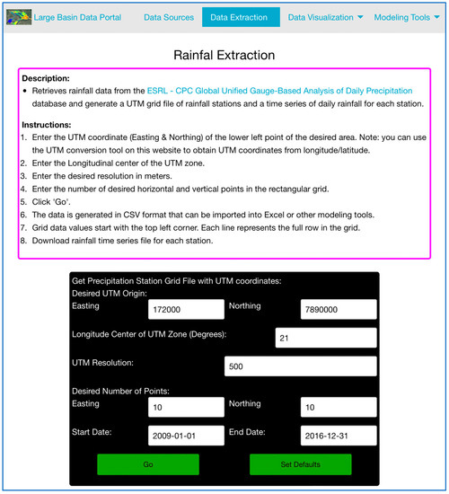 The rainfall extraction tool (Figure 4) can be used to extract rainfall data from the NOAA ESRL CPC global rainfall dataset [44]. The ESRL data are derived from various remote sensors and have a spatial resolution of 0.5° (equivalent to 55 km near the equator) and a 1-day temporal resolution. The tool assigns each desired grid point to a cell group, and a time series of rainfall is produced for each cell group based on the desired time period. The user needs to specify the model’s rectangular area and the resolution of the grid.