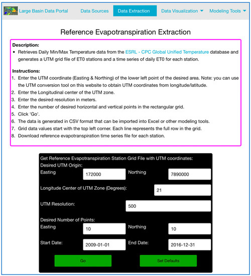 The reference evapotranspiration extract tool (Figure 6) downloads the daily min/max temperatures from ESRL’s CPC Global temperature datasets [44]. The coordinates are then remapped from Longitude/Latitude to UTM. Spatial interpolation is then performed to obtain temperatures at the desired grid points, and the reference evapotranspiration is calculated. Finally, the results are written into CSV text files that can be used in various modeling programs.