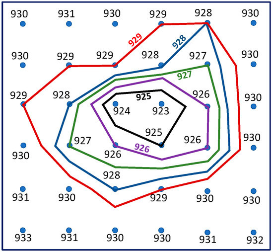 Illustration of elevation contour line construction for a sample elevation grid. The sample grid is a 6 × 6 grid with elevation at each grid point ranging from 923 m to 933 m above sea levels. In this example, contour lines for elevations 925 m, 926 m, 927 m, 928 m, and 929 m above sea level are constructed.