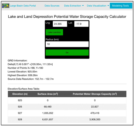 Screenshot of the lake storage calculator and a sample output for Lake Liambezi at the border of Botswana/Namibia showing the calculated lake water surface area and potential storage capacity when water levels increase from 925 m to 928 m above sea level. Data are derived from the Google Maps Elevation dataset.