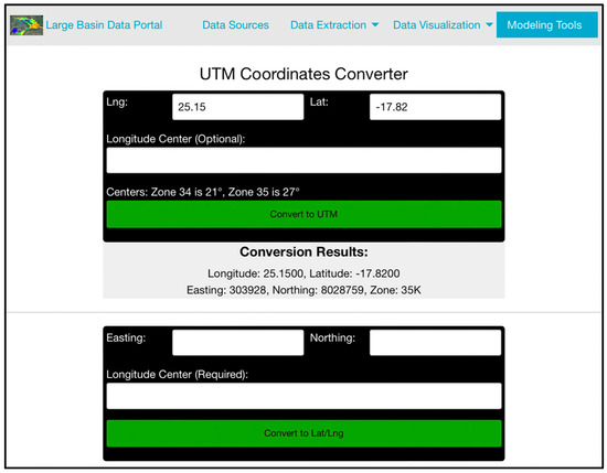The Longitude/Latitude spherical geographical coordinate system is not ideal for modeling. In many cases, an alternate geographical coordinate system with flattened rectangular grid is used, such as the UTM system. This basic coordinates converter (Figure 12) allows the user to convert point coordinates between the two systems using the calculations described in [52].