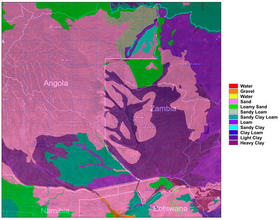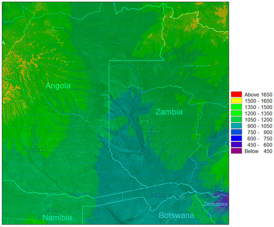 Within the larger Zambezi River Basin, we focus on the Upper Zambezi River Basin region spanning Zambia, Angola, Namibia, and Botswana (Figure 13) covering an approximate area of 514 km2 [53]. Local datasets for this large region are largely unavailable. Using the Large Basin Data Portal, we extracted various climatic, topographic, and soil data to create the inputs for a hydrodynamic model of the region. The hydrodynamic model was built using MIKE-SHE modeling software [39]. Data from 2009 to 2019 were extracted for the region (930 km × 914 km) with a resolution of 500 m, resulting in more than 3.4 million grid cells.