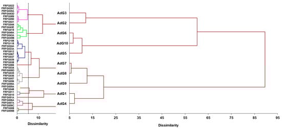The first 10 factorial axes (Principal Components), representing 93% of the total variance of the log-transformed dataset, were retained for the hierarchical classification of GWBs. The contribution of the different parameters on these factorial axes is presented in Table 2 and Table 3 for the two sub-regions, Adour-Garonne and Rhône-Méditerranée, respectively. The first axis, strongly correlated to major ions and electrical conductivity, was clearly an axis of water mineral load in both areas. However, it should be noted that the bacteriological parameters showed positive coordinates in the Adour Garonne basin, but negative in the RM basin. This reflected, for the RM basin, a bacterial contamination associated with diluted waters. The second axis was an axis of bacterial contamination in both areas. This contamination was clearly associated with the presence of Fe and Mn, positively scored, while the NO3 parameter has negative coordinates. It was, therefore, a factorial axis marked by redox processes, with the waters contaminated by bacteria being the reducing waters. However, the chemical profile differed, with, on AdG, a contamination that concerned weakly mineralized waters, and, in particular, characterized by low contents of Ca and HCO3. In the AdG basin, the third axis opposed the Na and Cl parameters to the HCO3 and Ca parameters. This was an opposition of chemical profile with, on the one hand, rather diluted waters with a sodium chloride chemical profile and oxidizing as shown by the NO3 coordinate, and on the other hand, more concentrated carbonate–calcium waters, probably deep because they are not very vulnerable to nitrate contamination. In the RM basin, the third factorial axis reflected the bacterial contamination of oxidizing waters positively scored with NO3 and negatively with metals. Axis 4 reflected moderate bacterial contamination on oxidizing waters, but independently of the chemical profile on AdG, whereas it reflected the opposition of the chemical profile on RM. The fifth axis indicated higher values of As associated with NO3 on AdG, and reduced acidic waters, positively scored with metals and also with bacteriological parameters. On RM, the fifth axis reflected acidic waters with the presence of metals and fairly vulnerable to bacterial contamination, conditions that can be observed on the crystalline massifs of altitude. In conclusion, on the two basins, the first factorial axis was quite similar, but notable differences appeared on the second factorial axis and on the following ones.