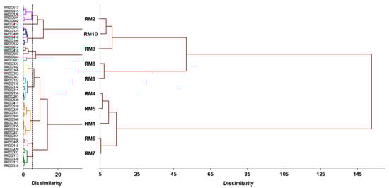 The tree structure resulting from the unsupervised clustering (dendrogram) for the AdG and RM basins is presented in Figure 2 and Figure 3, respectively. In total, 10 clusters were retained on each sub-basin. All parameters considered, the clustering structure showed, for both AdG and RM, large differences between GWB groups but also strong similarities of characteristics within GWB groups, with the dissimilarity between GWBs of the same group being often very small compared to the difference between groups. In order to be able to compare the loss of information related to clustering, 20 GWB groups were retained over the whole Occitanie region (cluster tree not shown).