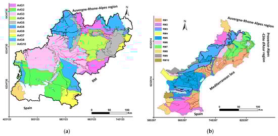 This approach was conducted in two ways. The first consisted of processing all the data from the Occitanie region, as proposed by Tiouiouine et al. [], but on a larger and more heterogeneous region. The second modality consisted of processing, separately, the data from each large watershed covering the region, namely the Rhône-Méditerranée (RM) and Adour-Garonne (AdG) basins, in accordance with the European management that structures the mapping of GWBs by large watersheds.