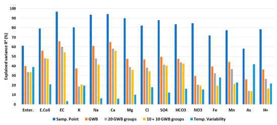 The area covered by a homogeneous zone of the same value in the map replaces a diversity of values measured on each sampling point, values that may be close but different. By replacing all the measurements made on a sample point at different dates by their average value on that sample point, there is a loss of variability that corresponds to the temporal variance. It should be kept in mind, however, that the temporal variance depends, in part, on the average number of analyses per sampling point. The differences observed between the two basins, AdG and RM, are therefore also partly explained by the difference in the ratios between the number of samples collected and the number of sampling points. The values of the temporal variance differ, of course, according to the parameters considered, some, such as metals, arsenic, or bacteriological parameters, having a high temporal variability (Figure 6). Similarly, by replacing the values acquired at the different sampling points by the average over the corresponding GWB, an additional part of the variance is lost, corresponding to the internal variability of the GWB. This loss of information is high for nitrate and potassium, which present a very local spatial variability, reflected by a strong decrease in R2. The other major ions and electrical conductivity show spatial variability on a much larger scale, depending mainly on the geological structure, and, for these parameters, the decrease in R2 from the GWB to the GWB group scale is limited. The loss of information when clustering GWBs is small despite the large reduction in units from 106 to 20.