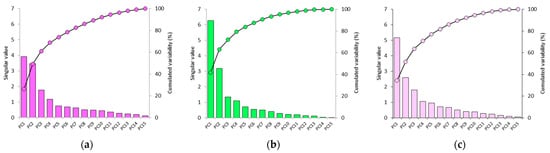 Inertia of the factorial axes for (a) AdG1, (b) AdG2, and (c) AdG3.