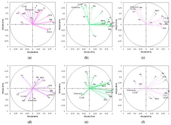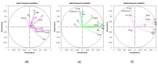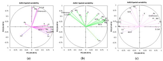 In terms of spatial variability, for AdG1, PC1 contrasted diluted waters with mineralized waters regardless of fecal contamination, whereas, for AdG2 and AdG3, the first factorial axis reflected a contrast between mineralized waters and diluted waters contaminated with E. coli and Enterococcus. An altitudinal gradient can be observed regarding axis 2. For AdG1, higher in altitude, PC2 exclusively carries the bacterial contamination associated with Fe and Mn metals. This contribution was less important for AdG2 and practically null for AdG3. In terms of temporal variability, fecal contamination associated with Mn and Fe shifted to axis 1 for the high altitude GWBs of AdG1 and increased on axis 2 for the Pyrenean foothills, AdG2, and the alluvial plains, AdG3. Note the contrast with nitrates associated with fecal contamination and metals for AdG2 and AdG3 but not for AdG1.