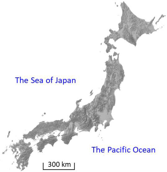 Figure 1 shows a shaded relief map of the main part of the Japanese archipelago [10]. Considering Japan’s land area, 73% is uninhabitable mountains and hills, 10% is coastal alluvial lowlands, and 12% is classified as intermontane basins and high plateaus. However, the above classification is not strict. For example, on land classified as coastal alluvial lowlands, plateaus are distributed in patches, limiting the extent of the floodplain; in mountain basins and plateaus, belt-shaped floodplains exist along river channels.