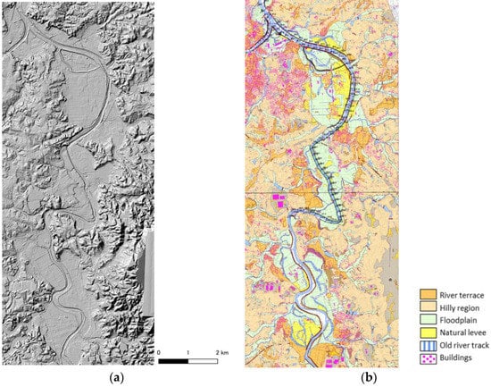 Natural river terrain on alluvial lowland is generally composed of a waterway that overflows at an average recurrence interval of approximately one to three years (e.g., Refs. [1,2]) and a floodplain formed by the sediment discharged from the waterway during overflow events. The latter is regarded as a river area during large rain runoff events. The floodplain surface contains nutrient-rich fine sediment and thus has long been used for farming (especially paddy fields). Villages and main roads were traditionally located on relatively high land, such as natural levees in the floodplains and river terraces adjacent to the floodplains.