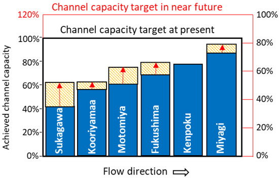 Figure 4 shows the longitudinal distribution of the river channel capacity improvement achieved by a first-stage project currently underway on the Abukuma River [12]. On the vertical axis on the left-hand side, the target of the final plan is indicated by “100%”. The blue bars are the values at the start of the project (in 2005) and the orange bars with red arrows are the projected increases until the completion of the project (in 2035). The longitudinal average improved from 65% to 75%, but the amount of work remaining (from the top of a bar to the 100% level) is large. The river section shown in Figure 3 corresponds to Sukagawa, the most upstream point in the graph, where the channel capacity improvement is much lower than that for the downstream section. From the perspective of fairness of public works, the target safety level for Rank A river reach of each first-class river system is generally constant. In practice, however, because the river improvement works are carried out from downstream to upstream, the completion rate of levees is generally lower in the mid-upstream farming land than in the downstream urban area.