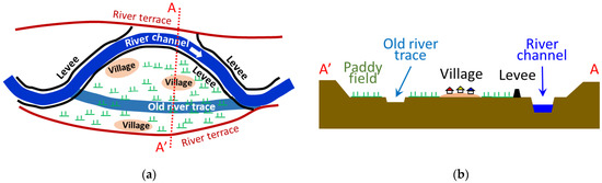 Upstream river channels have historically meandered on floodplains between river terraces, changing course (see Figure 3). During heavy floods, the river water spreads over the floodplains. More recently, levees were built on both sides of a river channel to reduce the extent of flooding, thus dividing the floodplain into a series of closed areas. In a floodplain, traces of old rivers form a relatively low-lying belt and surrounding areas are used for rice cultivation. Villages sit on natural embankments slightly above the paddy fields. Figure 5a,b show a schematic plan view of an upstream floodplain and a diagram of its cross section along the line A-A′, respectively.