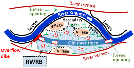 Ishikawa [8] and Ito et al. [9] investigated the possibility of restoring the retarding effect of upstream floodplains against excess rain runoff and proposed the concept of an RWRB, which is shown in Figure 6. An overflow dike is installed near the upstream edge of a closed floodplain, the top of which is set at the design HWL of the levee so that a flood smaller than the channel design discharge does not flow into the floodplain. When the HWL is exceeded, excess water flows into the RWRB and spreads over the paddy fields as shown by white arrows with red lines. Since there is a freeboard of 1 to 1.5 m from the HWL to the crest of the levee, it will not be overtopped unless an extraordinary flood occurs. The levees on the downstream side of the floodplain are opened for the drainage of floodwater. In the flood rising phase, the river water runs up from the opening, but since the ground in the river upstream area is sloping, the range of run-up is small. The stored water also dissipates the energy of flow from the old river traces.