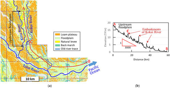 Figure 7a shows a flood control landform classification map for a wide area that includes a long floodplain formed by flooding from the Kinu River and the Kokai River. The two rivers composed one river system that flowed to the Pacific Ocean before the 17th century. The floodplain is called the Old Kinu River Floodplain herein. Figure 7b shows a topographical cross section on the longitudinal line of the floodplain indicated by the red line A-B in Figure 7a. The catchment area of the Kokai River upstream from the point marked C in Figure 7a is about half that of the Kinu River.