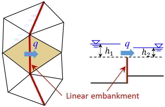 Embankments narrower than a triangular grid (levee or road) were treated as a linear element. The flow rate over such embankments was calculated using Honma’s equation [30] using the water depth of the adjacent triangular element.