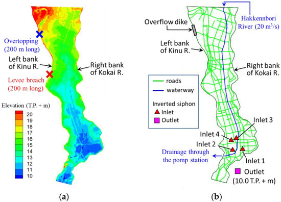 Numerical simulations were performed for the three cases shown in Table 3. For Cases 1 and 2, the hydrograph of flooding from the Kinu River was applied to the locations indicated by the cross marks in Figure 12a. For Case 1, the drainage at the pump station was taken into account. For Case 2, the drainage by the inverted siphon was also considered.