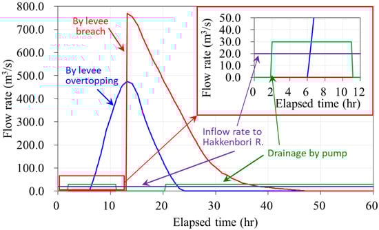 The blue line in Figure 13 represents the flooding from the overtopping point and the red line represents that from the levee breach point. These were estimated by Ohtsuki et al. [32] based on a field investigation of the disaster. Since the actual discharge of the Hakkenbori River on the day of the flood is unknown, it was assumed that the discharge was the planned irrigation discharge (20 m3/s) indicated by the purple horizontal line in Figure 14. It was also assumed that the floodwater was discharged at the maximum pump capacity (30 m3/s), as shown by the green line, from the downstream end of the Hakkenbori River to the Kinu River. The pump operation was stopped from 11:00 to 20:00 due to the HWL in the Kinu River. Note that the inflow and outflow of the Hakkenbori River are negligible compared with the amount of floodwater from the Kinu River. In addition, for Case 1, the amount of drainage by large pump trucks mobilized by river administrators was not considered due to a lack of data.