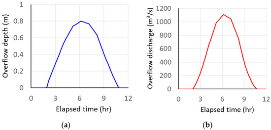 For Case 3, the performance of the RWRB for excess runoff was investigated. The overflow water depth of the overflow levee must be within 1.5 m, which is the freeboard of the Kinu River levee. Therefore, as shown in Figure 14a, a case study was conducted under the assumption of an excess runoff with a maximum overflow depth of 0.8 m. From Equation (1), the corresponding overflow discharge was obtained as shown in Figure 14b. The peak discharge is about 1150 m3/s. On the other hand, the bankfull discharge observed in the 2015 flood was about 4200 m3/s; therefore, if the crest of the overflow dike is set to 1.5 m below the levee crown, the peak discharge is reduced to 3100 m3/s, leaving a clearance of 0.7 m.