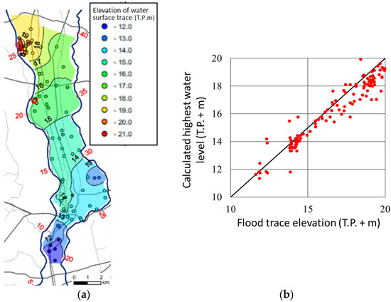 Figure 15a shows the results of a floodwater surface trace survey conducted by Ohtsuki et al. after the 2015 flood [32]. Figure 15b shows the correlation between the survey results and the highest water level at each point obtained in the numerical simulations. The agreement is fairly good.