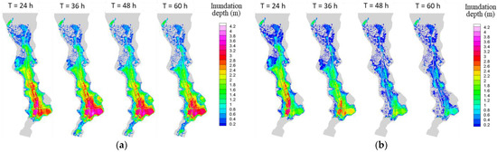 Figure 16a,b show the temporal change in the inundation depth distribution for Cases 1 and 2, respectively. The light gray area in the background of each figure indicates the computational domain shown in Figure 12. Due to the limitation of the pump capacity (indicated by the green line in Figure 13), the flooded area hardly decreased. A comparison with the landform classification map shown in Figure 8 indicates that the houses on the natural embankments were flooded even at an elapsed time of 60 h. For Case 2, in contrast, the inundated area rapidly decreased. At 24 h after the start of inundation, the inundation depth was already smaller than that for Case 1. The natural embankment at the southern end of the calculation area was not inundated throughout the simulation. After 48 h, most of the natural levees on both sides had dried up.