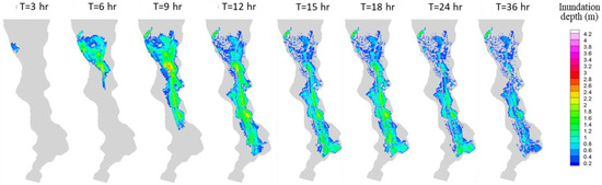 Figure 17 shows the simulation results for Case 3, in which the artificial inundation in the floodplain was caused by the overflow dike. Overflow started at an elapsed time of 2 h, peaked at 6 h, and ended at 10.5 h, as shown in Figure 14b. After that, the inundation area gradually moved downstream while the water depth decreased. Compared with Case 1 with the levee breach shown in Figure 16a, the inundation depth is smaller and the inundation time is shorter. The inundation depth was less than 0.5 m in most areas at an elapsed time of 36 h. Most importantly, the natural levees on which houses are located were not flooded at all. The reason for this is the difference in the total volume of floodwater. The flooding controlled by the overflow dike stops when the water level drops below the top of the dike, so the amount of floodwater is limited. For a levee breach, on the other hand, river overflow continues until the water level in the river channel falls below the ground level, resulting in a very large floodwater volume. This difference has a significant impact on flood damage in closed floodplains for which the downstream ends are interrupted by continuous embankments.