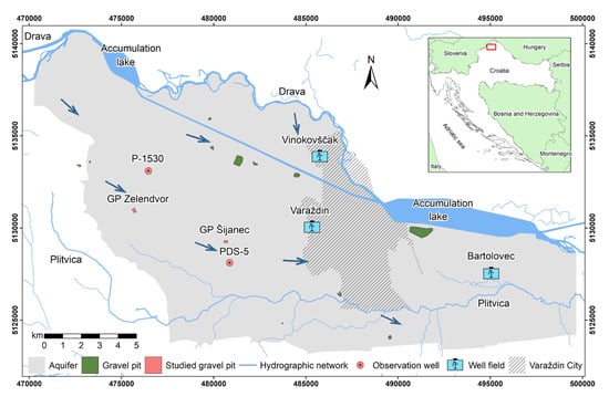 Geographical position of the study area with indicated locations of the investigated gravel pits and observation wells. Blue arrows indicate groundwater flow direction according to Karlović et al. [].