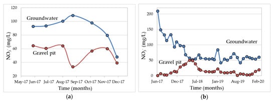 Time series showing the decrease in nitrate concentrations of the groundwater in the (a) active gravel pit and (b) inactive gravel pit.