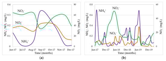 Although gravel pits are mainly recharged by groundwater, and the observation wells are not far away, significant differences in nitrate concentrations were observed (Table 1; Figure 2). Both observation wells had high nitrate levels, with mean concentrations exceeding the threshold value of 50 mg/L. This is influenced mainly by agricultural activity in this part of the aquifer [,]. Seasonal peaks of groundwater nitrate concentrations are associated with the rainy season, during which nutrient leaching from cultivated areas is increased, but also with the dry season, during which the absence of rain events is replaced by intensive irrigation. As a result, the highest nitrate concentration of around 210 mg/L was measured in a groundwater sample collected in summer (June 2017). Conversely, the nitrate concentrations of the gravel pits were lower than those of groundwater throughout the whole study period. Mean nitrate concentrations reduced more than 30 mg/L within the active gravel pit. An even greater decrease in nitrate concentrations was observed in the inactive gravel pit, with maximum values around the 50 mg/L threshold value. The nitrate concentrations of the gravel pits varied among hydrological periods, which is likely controlled by the inflow of groundwater nitrate concentrations, the dilution of lake water by rainwater, and nitrogen transformation processes. Low NO2− and NH4+ concentrations have been recorded in groundwater samples, often below the detection limit. However, low NO2− and NH4+ concentrations in gravel pit waters are generally observed during the colder parts of the year, when higher nitrate concentrations are recorded (Figure 3); conversely, peak NO2− and NH4+ values are measured during the warmer parts of the year, when nitrate concentrations are seen to decrease. This reversal indicates seasonal changes in the dynamics among nitrogen species, possibly due to nitrogen transformation processes.