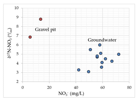 Relationship between the nitrate concentration and nitrate isotopic composition (δ15N-NO3) of the inactive gravel pit and nearby groundwater (values for groundwater are interpreted in Marković et al. []).
