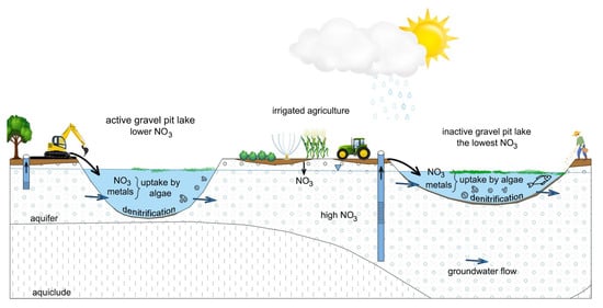 Gravel and sand are non-renewable natural resources which are used in the construction industry for various infrastructure projects (e.g., buildings, roads, and other concrete-based structures). With population growth, the demand for these mineral resources is increasing. The U.S. Geological Survey estimates that the world produced about 265 million metric tons of sand and gravel in 2020 []. The results of gravel and sand excavation include gravel pits, which change the morphology and drainage pattern of catchments []. The locations of gravel pits are conditioned by the position of natural deposits of sand and gravel, such as alluvial river deposits, streambeds, glaciofluvial deposits, etc. When sand and gravel extraction occur below the water table, groundwater naturally fills the gravel pit, forming a lake. The creation of gravel pits can therefore affect groundwater quality, which is especially important in areas that use groundwater as a source of drinking water. As a result of excavation, the protective soil cover is removed, which exposes the aquifer to the atmosphere and increases its vulnerability to contamination []. Another threat to groundwater quality is related to the illegal waste disposal in inactive gravel pits [,], which has an impact on both the gravel pit water and the downstream groundwater. Thus, it is very important to investigate the interaction between gravel pits and groundwater, particularly when gravel pits are formed in areas close to groundwater abstraction sites []. In general, limited attention has been paid to the positive effects of gravel pits on water quality compared to the negative ones. However, several studies have recognized that gravel pits can mitigate groundwater nitrate contamination originating from agricultural activity through assimilation by algae and/or bacterial denitrification [,,]. Additionally, the inflow and accumulation of nutrients into the gravel pits may cause eutrophication and interfere with metal cycling []. There is potential to use gravel pits as nutrient filters and to regulate groundwater nitrogen pollution, but it is important to understand the factors responsible for nitrogen removal [].