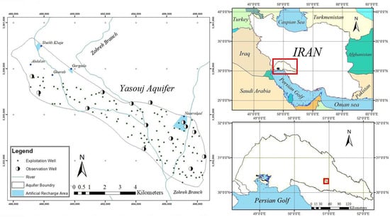The Yasouj Plain (30°10′–30°27′ N, 50°15′–50°21′ E) is located in Kohgiloyeh and Boyer Ahmad Province, southwest Iran. The Yasouj aquifer has an area of 54.1 km2 (Figure 1). The average rainfall in the area is 600 mm, mainly due to the high altitude regions in the area. However, despite high rainfall and the small area of the aquifer, most of the required water is supplied from groundwater resources. In recent years, the groundwater level has dropped remarkably due to decreased rainfall, decline in recharge and excessive groundwater exploitation [2,32]. Therefore, in order to prevent the excessive drop of the groundwater level and to control the flooding of river water and atmospheric precipitation, areas have been considered to control precipitation and surface flows as the artificial recharge plan. Out of these areas, five are located on the Yasouj aquifer. Their locations are on alluvial layers, being suitable for aquifer recharge. Two are inactive due to the lack of dredging of the canal bed, a challenge observed in some plains in Iran, and only three areas are active and usable, the largest of which is Naserabad, located in the northeast of the aquifer (Table 1) [2].