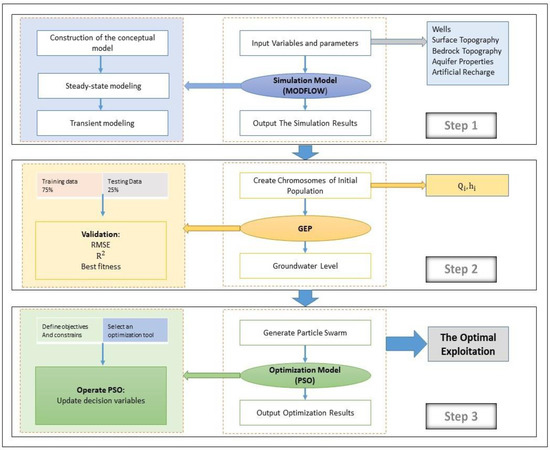 For the optimal exploitation of the aquifer under artificial recharge, a simulation–optimization model is presented, which includes three main steps (Figure 2). Step 1 includes a numerical simulation that considers the flow of groundwater and the effectiveness of the artificial recharge. Step 2 utilizes GEP to estimate the drop in groundwater level due to various aquifer exploitations. Step 3 involves an optimization model based on PSO to propose optimal management of aquifer exploitation and estimate the permissible withdrawal volume from the recharged water. All three steps are performed to check the state and decision variables. Groundwater level drop is the state variable, the value of which is obtained in Step 1 based on the groundwater flow simulation model. The decision variable is the pumping rate, and its optimal values are calculated in Step 3 using the optimization model.