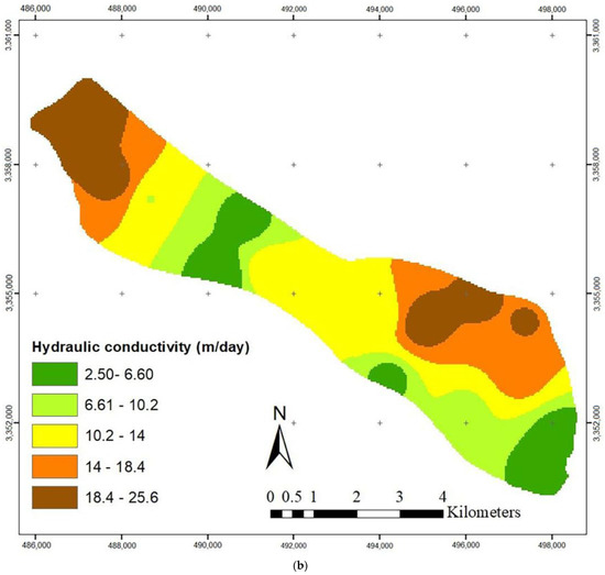 Calibrated (a) specific yield (%) and (b) hydraulic conductivity (m/day).